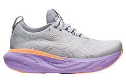 The Asics Gel-Nimbus 25 Wide WMNS in Piedmont Grey and Pure Silver is an exceptional running shoe designed to cater to the needs of female athletes who require a bit more room without sacrificing performance. Known for its impressive cushioning and support, this iteration of the Gel-Nimbus series features advanced technology like the FlyteFoam Propel midsole, which delivers a super soft yet responsive ride. The shoe's GEL technology in the rearfoot and forefoot ensures excellent shock absorption, reducing the impact on joints and muscles during each stride. Additionally, the engineered knit upper offers a snug, adaptive fit that moves seamlessly with the foot, providing both breathability and a sleek, modern aesthetic.